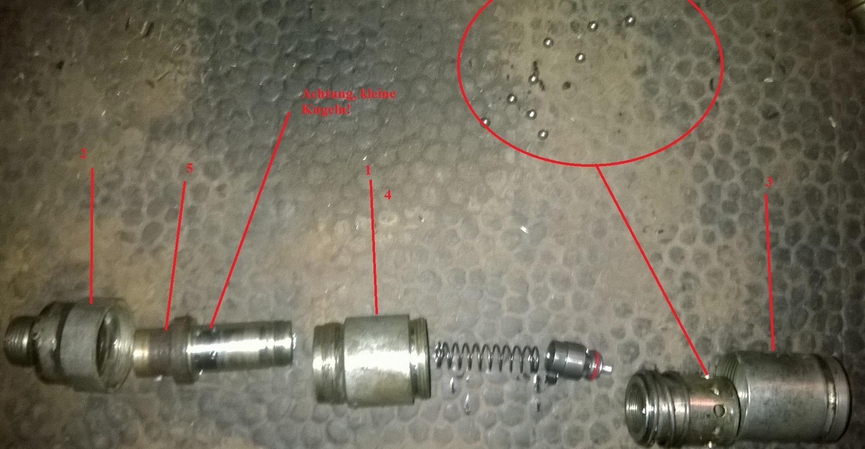 Einfach aus dem Hydrauliksteuergerät herausschrauben, das eine Mittlere Stück (1) in den Schraubstock spannen