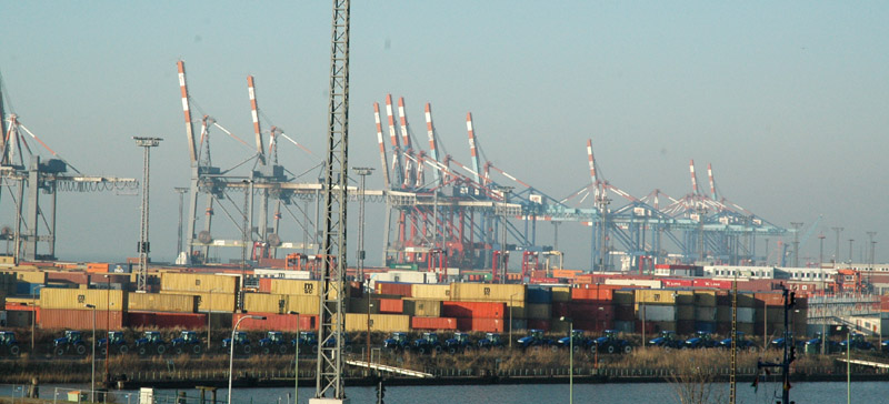 Erst daheim in Hamburg ist mir dann aufgefallen, daß sich vor den Containers New-Holland Großtraktoren verstecken...