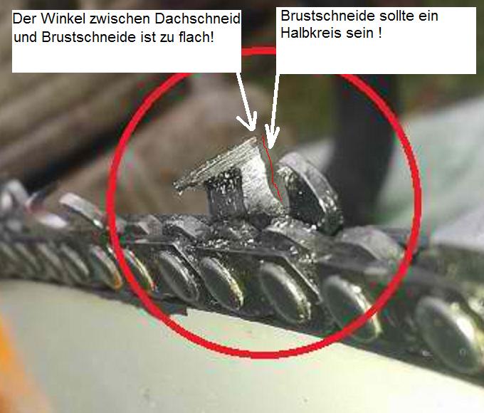 Der seitliche Teil des Zahns darf garnicht schneiden, da du sonst deinen Schnittschutz wirkungslos machst, Stichwort Kantenschliff