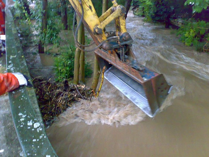 Ich selbst bin seit 5 Uhr auf den Beinen bis Mittag war ich mit dem Rückewagen unterwegs und habe im Gemeindebereich vor den Brücken das Schwemmholz herausgezogen, ab Mittag war dann der Vater mit dem RW unterwegs und ich bin bis jetzt auf einem 16t Bagger gesessen um noch Brücken ausräumen.
