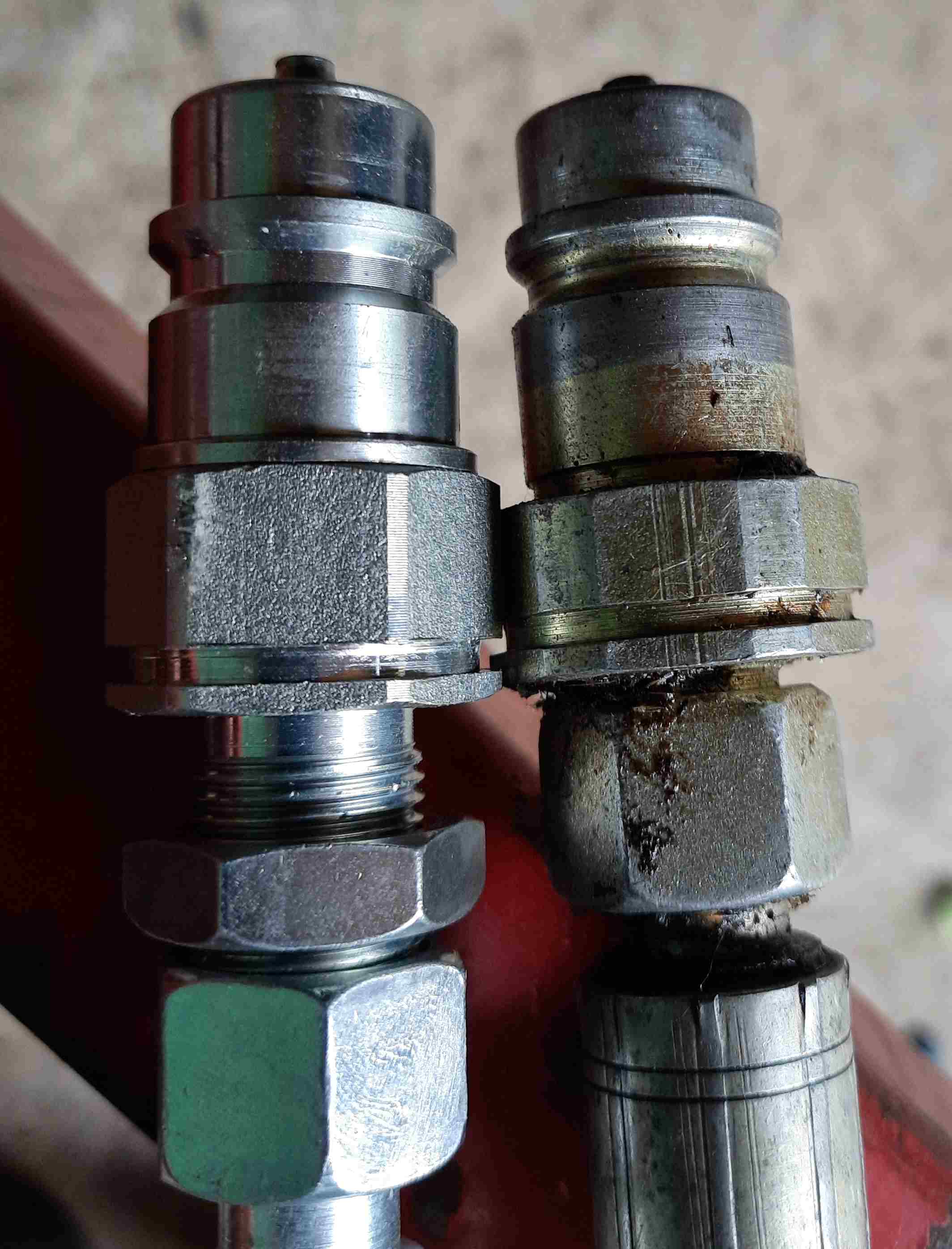 Offensichtlich wirkt da etwas wie eine Art Schlauchplatzsicherung .... Ich kann derartiges aber nicht entdecken. Vom Zylinder (Bild 1) führt die Leistung zum Hubbegrenzer (Bild2). Danach zu einem T-Stück. Dazwischen sind keine weiteren Elemente verbaut. Nachdem über das T-Stück auch der zweite Hänger mit Öl versorgt wird, kann die Ursache nicht in der Strecke vom Schlepper bis zum T-Stück liegen. Denn beim angehängten Kipper tritt ja der Effekt nicht auf.