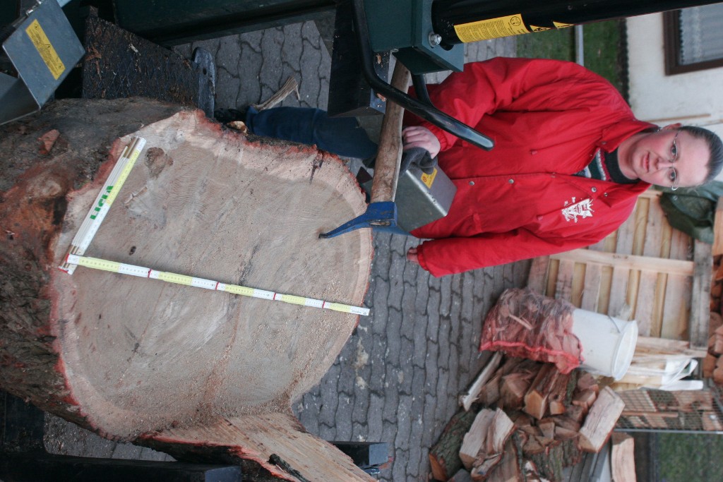 Vor Jahren haben wir in einem Flächenlos auch solche Stämme von Hand mit einem Vorschlaghammer gespalten. Da wir nur einen Metallkeil haben, besitzen wir zusätzliche Keile aus Holz. Metallverstärkungen an den Spitzen der Holzkeile werden nicht benötigt. Die Holzkeile haben verschiedenen Längen und Durchmesser. Der längste Keil ist 60 cm lang und 15 cm breit, wobei die Länge der Spitze nur 20 cm beträgt. Der Rest ist als Shaft ausgeführt.