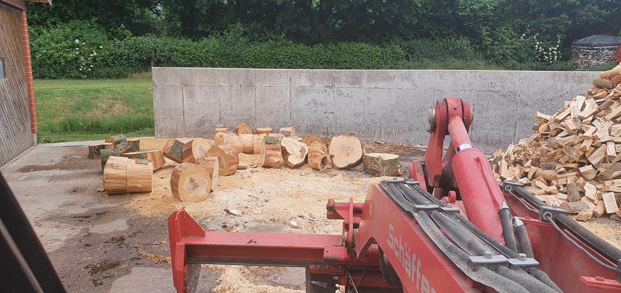 Ich habe mir auch gleich noch einen guten Liegendspalter mit 400V Anschluß gekauft und werde damit zu Hause direkt vom Anhänger die Hälften Ofenfertig machen. Das wäre vom Radlader aus doch zu schwierig.