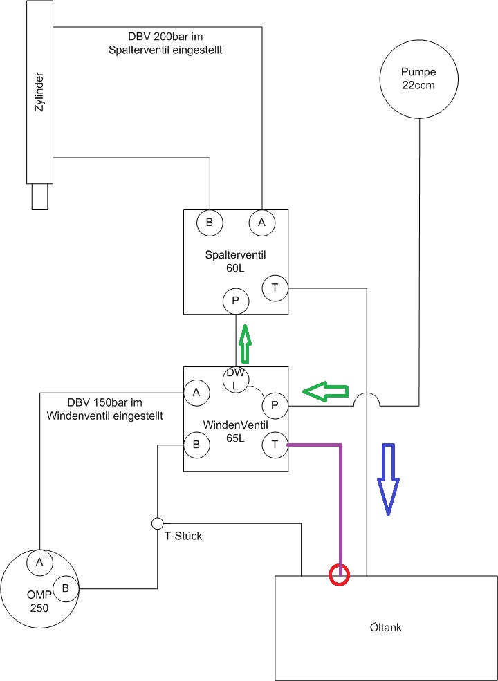Gehen wir mal von Neutralstellung beider Ventile aus, dann geht das Öl den Weg der grünen Pfeile, der drucklose Umlauf findet im Spalterventil statt (hier geht das Öl letztendlich vom P in den T-Anschluß). Der T-Anschluß am Windenventil bleibt trocken!