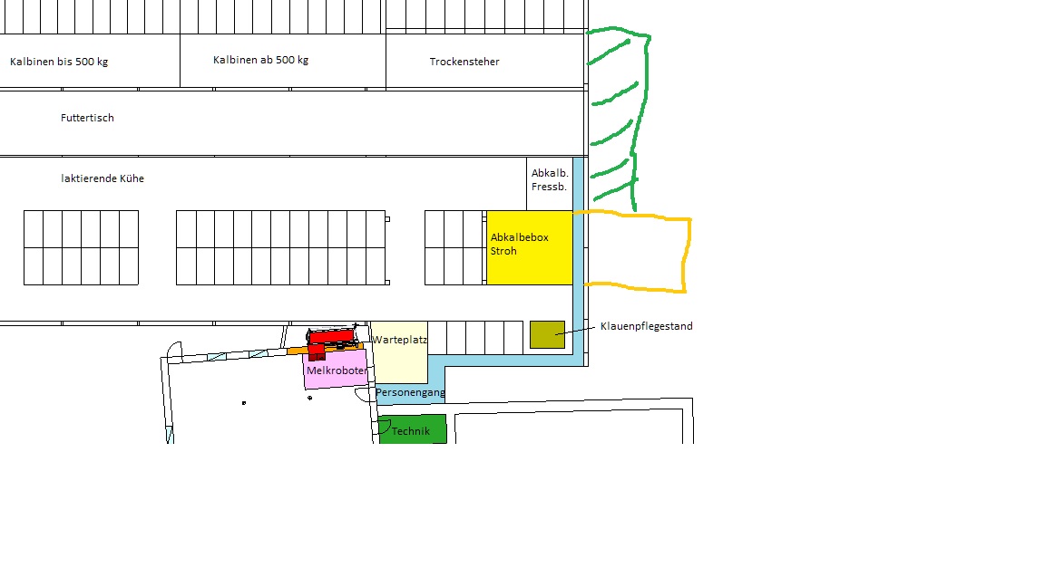 Was wäre wenn du die Box etwas größer machst, damit du die Abkalbekühe und Special Needs auf Stroh halten kannst. (Gelb)