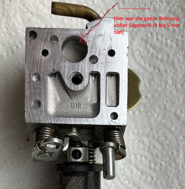 Ich dachte eigentlich ich hätte den Fehler schon gefunden, da im Vergaser auf der einen Membranseite (siehe Bild und Pfeil) die 8,5bzw. 9mm Bohrung bis zum Sieb voller festgepresstem Sägemehl war (ca. 4mm tief). Leider habe ich von dem Zustand kein Bild gemacht, weil ich mir sicher war, dass dies wohl der Grund meiner Probleme war. Leider lief die Säge danach nicht wirklich besser und geht beim Loslassen des Gasgriffes schnell aus....