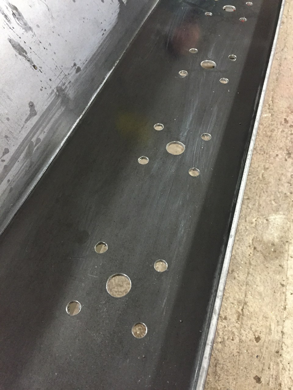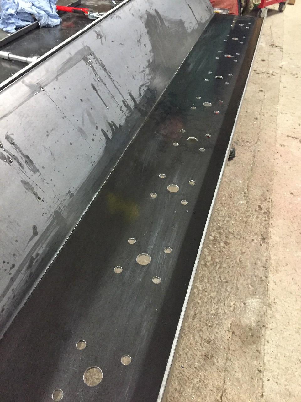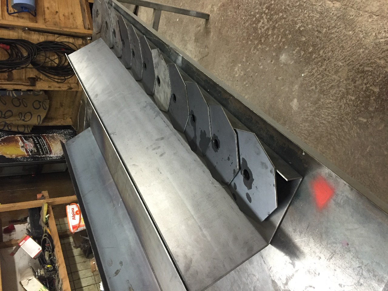 Jetzt geht's dann mit Löcherbohren im Grundträger weiter und mit dem Befestigen der Flanschlager.