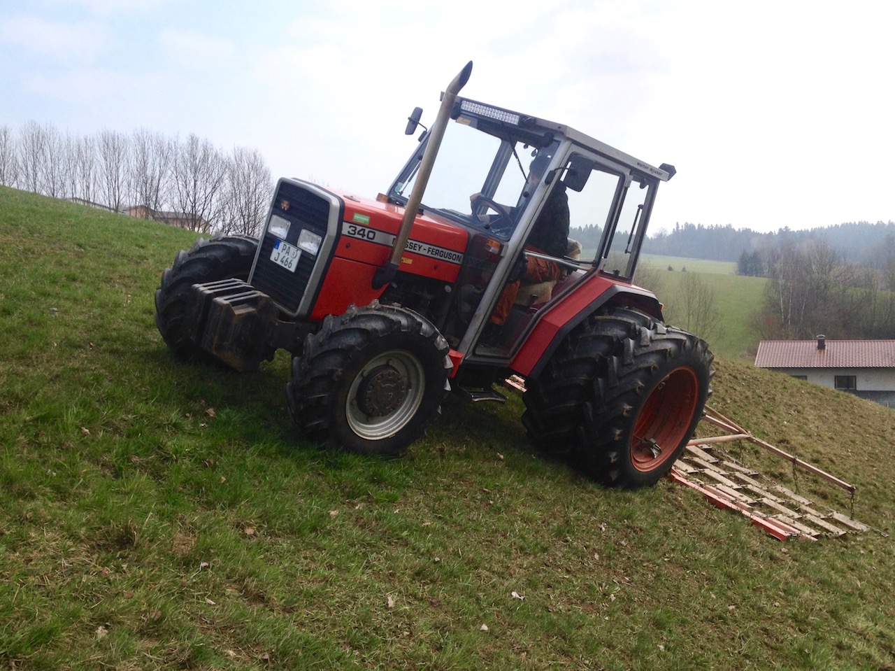 Obwohl schon Rentner, kauft er sich alle paar Jahre einen neuen Traktor. Nach einigen New Holland hat er jetzt einen LINDNER Lintrac 90 . Höhe 2,38 m.