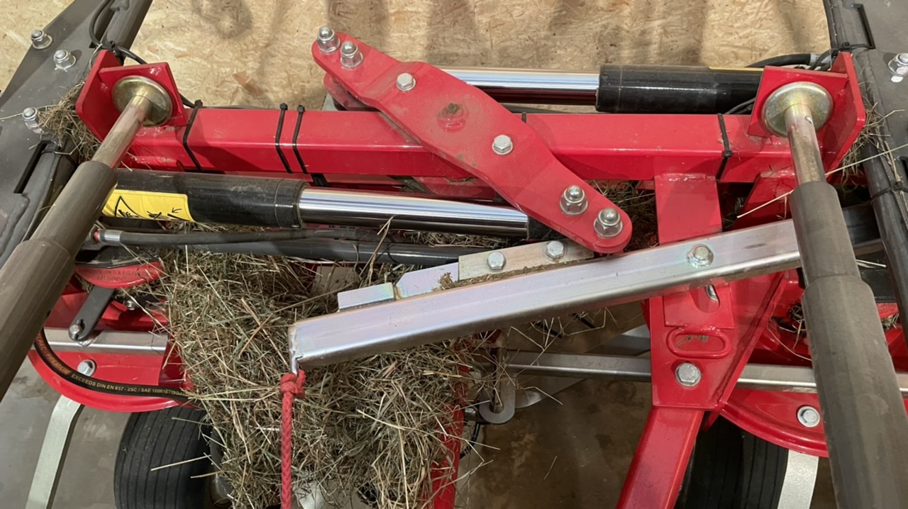 Die Silberne Verriegelung wird in Fahrtrichtung gezogen. Auf dem Bild ist jetzt die Transportstellung zu sehen. In arbeitsstellung fährt der anschlag auf der linken Seite gegen den Klotz und ist so der endanschlag für den Vorgewende aushub.