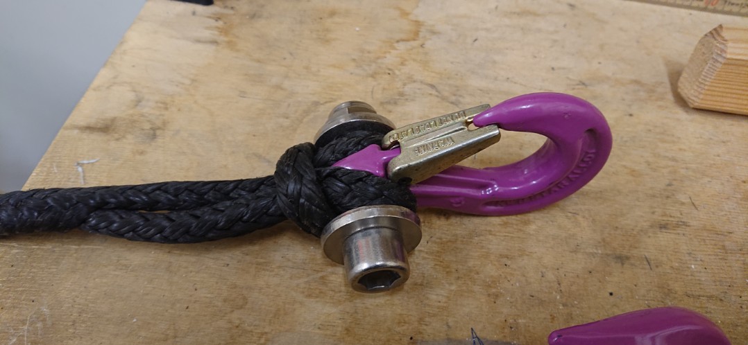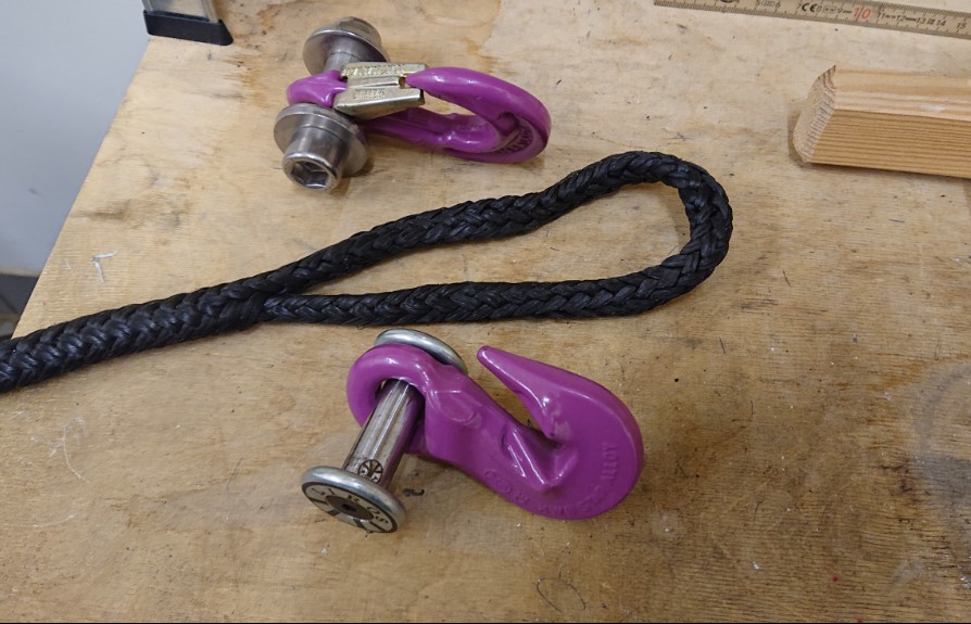 Sind es dagegen zwei. Dann wahrscheinlich auf einer Achse angeordnet (Anschlagmittel 1 / Windenseil / Anschalgmittel2). So befinden sich beide neben der Kraftlinie. Das heißt wird nur in einen einhängt kommt immer eine Knickwirkung auf des Seilende beim ziehen. Bei einem Stahlseil kann ich mir nicht vorstellen das dass lange ohne Schäden gut geht.