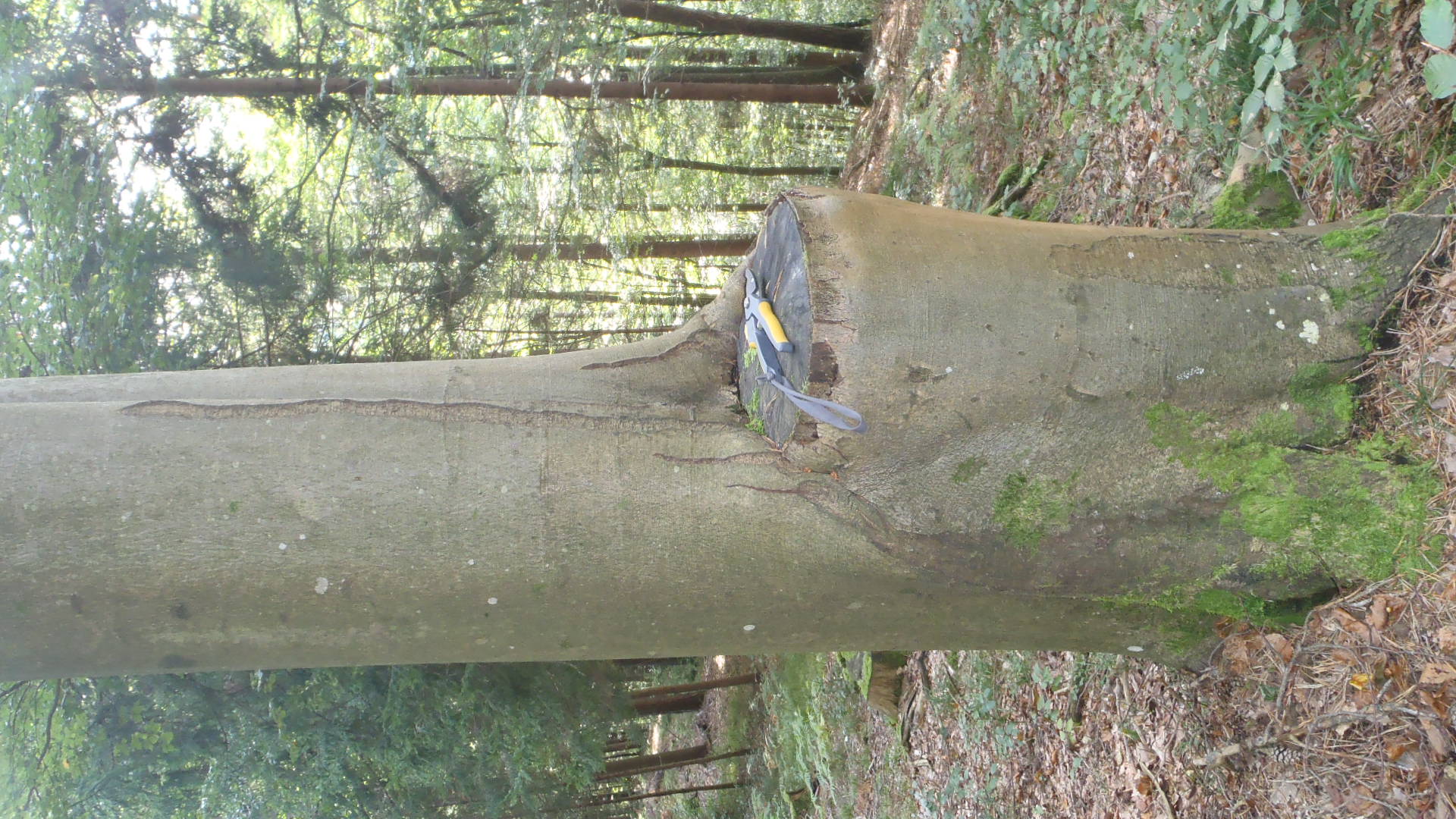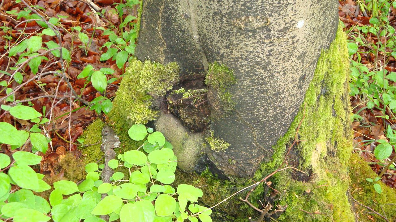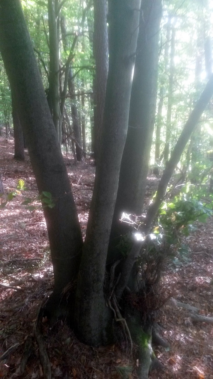 In einem unserer Waldstücke sind uns heute vermehrt Buchen Zwiesel aufgefallen (siehe Bilder unten). Die Bäume teilen sich alle in Bodennähe auf mehrere einzelne Stämme auf.