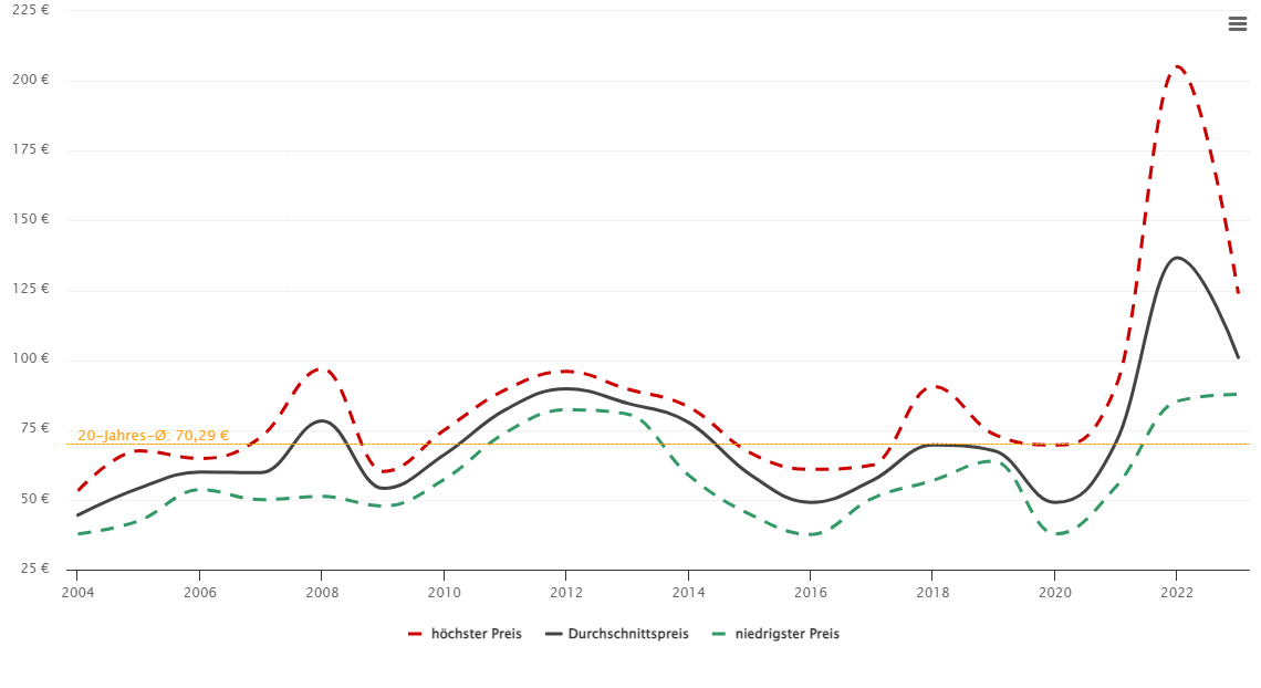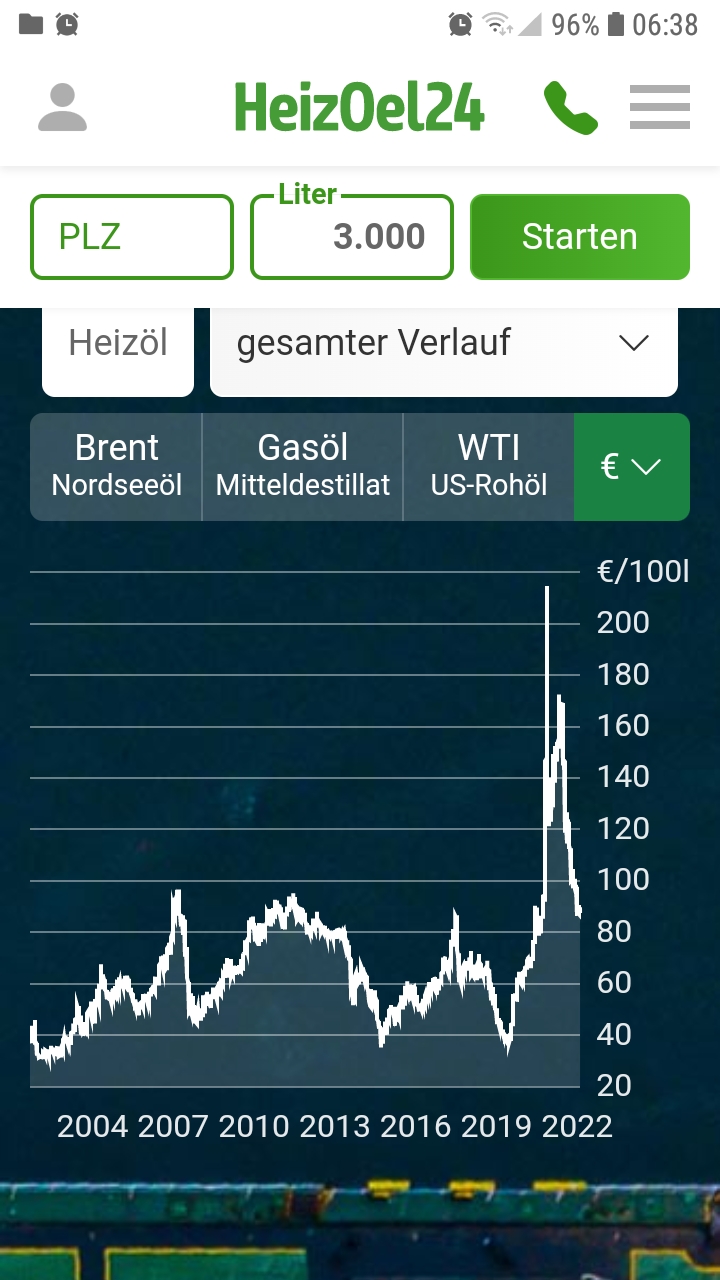 Weder 2010 noch 2020, und schon gar nicht 2023 war Heizöl so günstig.... Der Ø Preis liegt bei über 70-80 Cent seit 2008, also seit 15 Jahren.