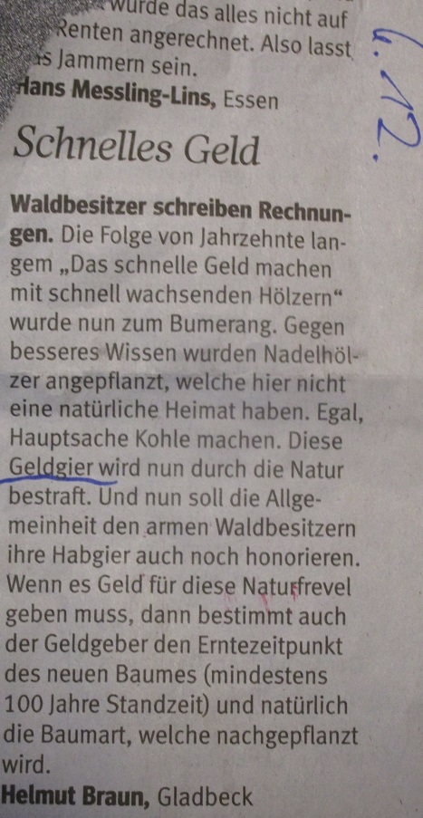 sind diverse Leserzuschriften, die man heutzutage immer wieder mal in Zeitschriften oder im Netz liest. Da schreibt ein völlig unbedarfter Stadtmensch frei von jeglicher Ahnung über Zusammenhänge einen hetzerischen Leserbrief, wie z.B. diesen hier, heute am 6.12. 2019 in der Westfalenpost im überregionalen Teil zu lesen, geschrieben von einem Helmut Braun aus Gladbeck.