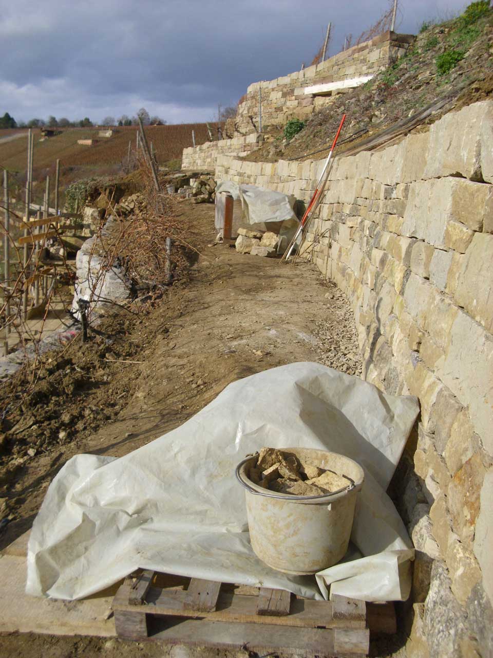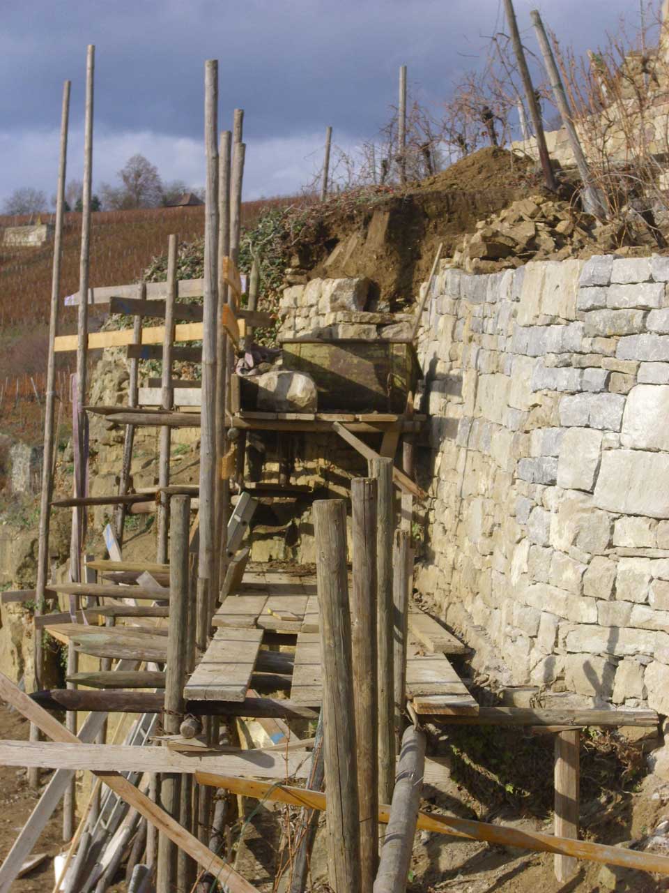 Bewässerung ist im Rosswager Neubau wohl vorgesehen, wenn ich recht gesehen habe, sind in der Treppe/Wasserstaffel zwei Kavernen als Wasserreservoir eingebaut. Kann man ja auch recht einfach machen, wenn mit dem Kran gebaut wird. Von Hand natürlich nicht. Das ist schon einer der extremsten Parzellen hier, pro Rebzeile eine Terasse.