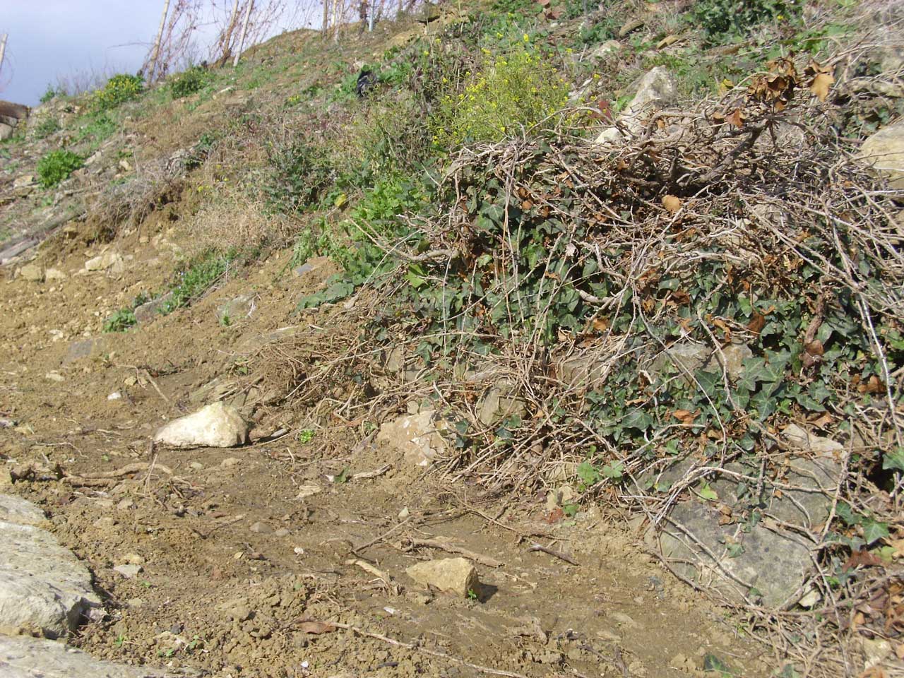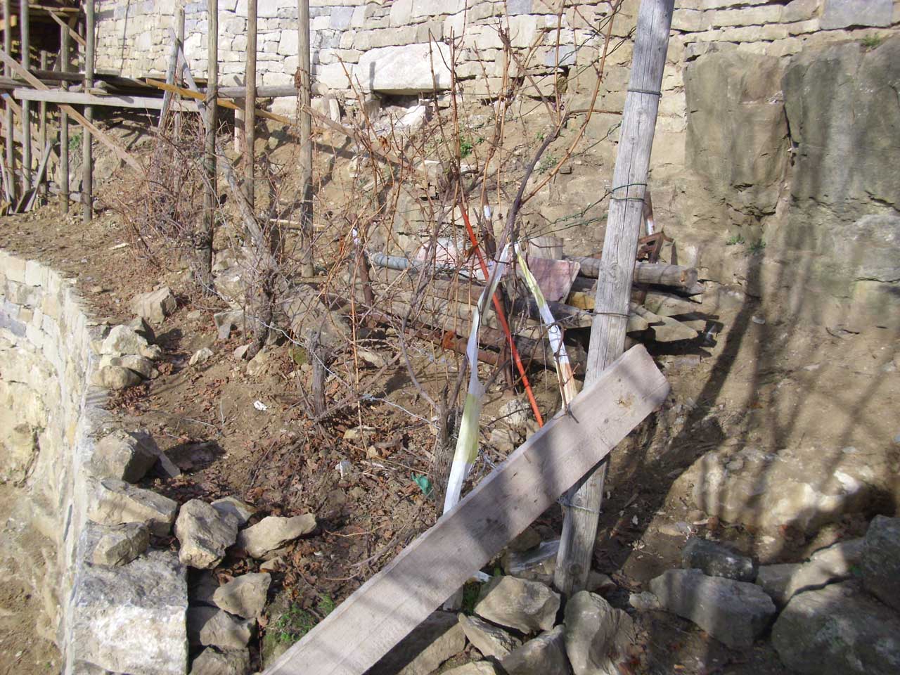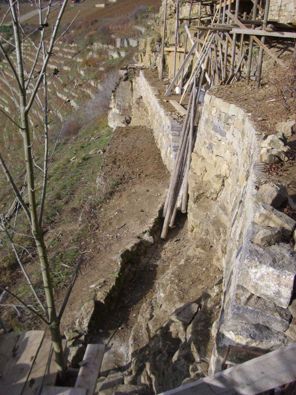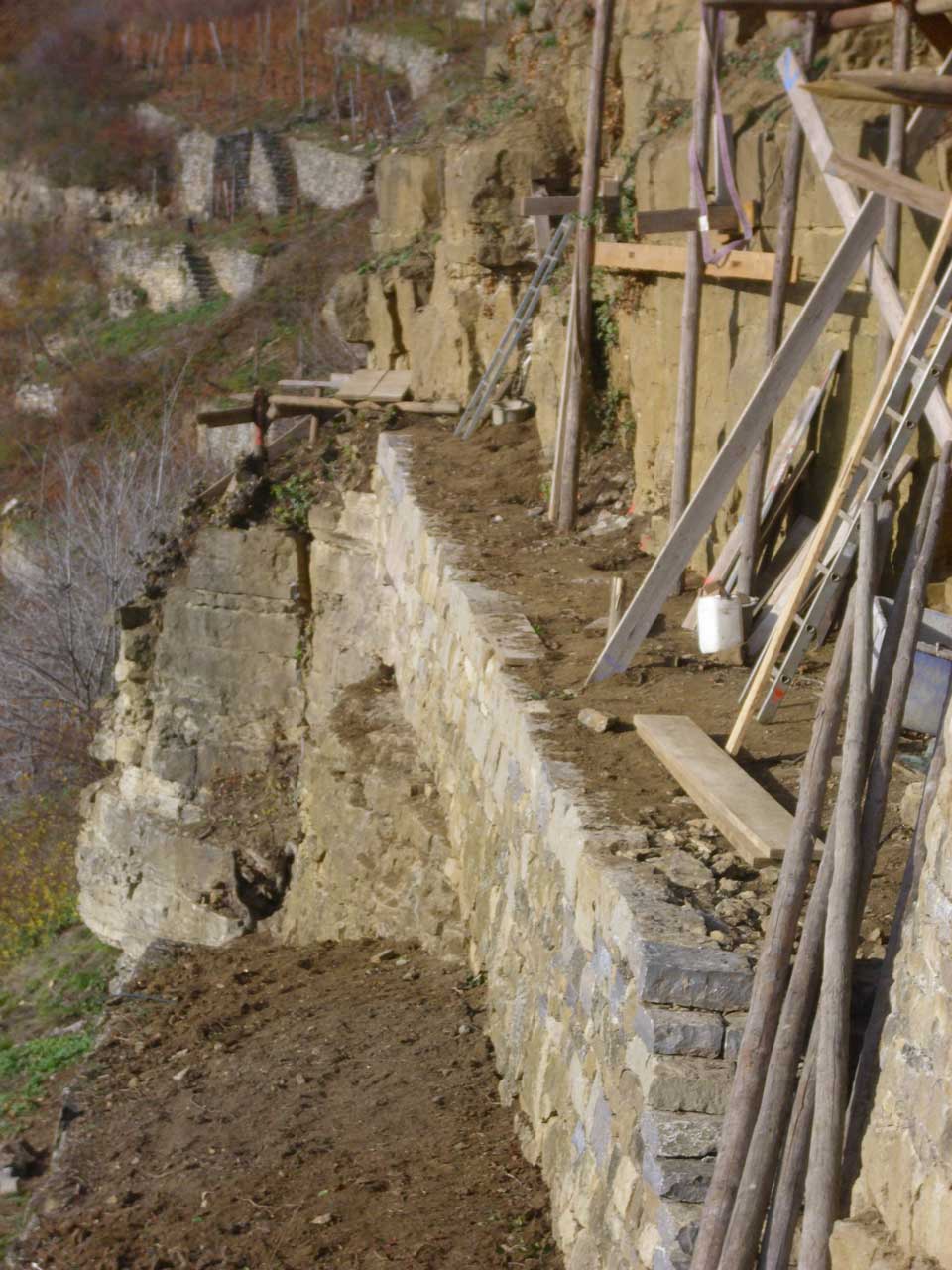 An einigen Stellen ist gut zu sehen, wie wenig Erde da zum Teil mit gigantischen Mauern an den Fels "rangeklebt" wird. Diese ganz extremen Mauern wird man wohl auch als Steinschlagschutz sehen müssen.
