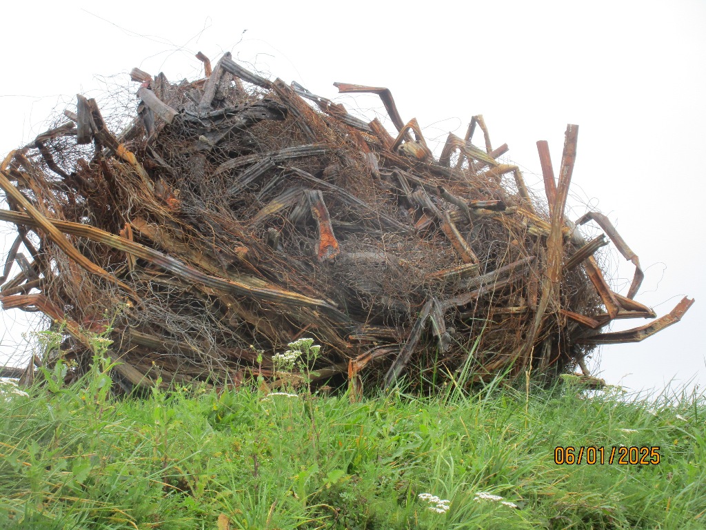 Da hat jeder einen recht großen Bagger, da wird grad an der Zeile entlang gefahren, greift Schaufel um Schaufel in die Erde, ein bisschen geschüttelt, kein Draht oder Stickel entfernt, auf dem Weg zurück grad mit der Schaufel zusammengeschoben, dann am Schluß alles auf nen großen Haufen, und dann raucht es mal paar Tage. Und bisher wurde dann der Rest einfach vergraben neuerdings kommt der Rest tatsächlich in die Schrottmulde, Abrollanhänger hat ja auch fast jeder.