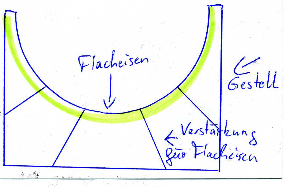 Ich stelle mir das so vor das ich das Flacheisen an den Enden soweit zusammenbiege das ich den notwendigen Durchmesser erhalte. Aufgrund der vorher gewählten Länge müsste ich einen Halbkreis bekommen der dem halben Durchmesser des Bündels beträgt. Die beiden Enden würde ich auf einem Gestell befestigen und das Flacheisen das den halben Umfang bildet bzw den Korb würde ich am Gestell wiederrum abstützen.
