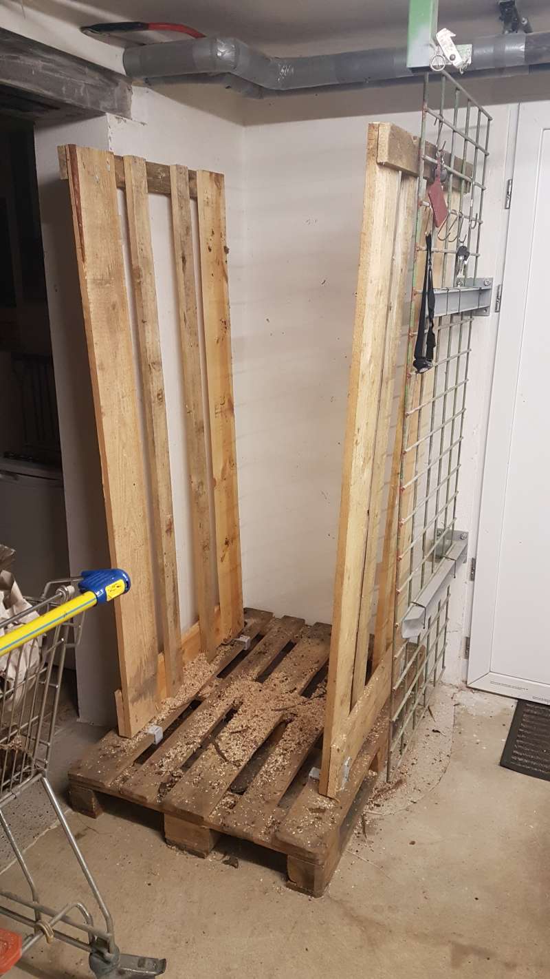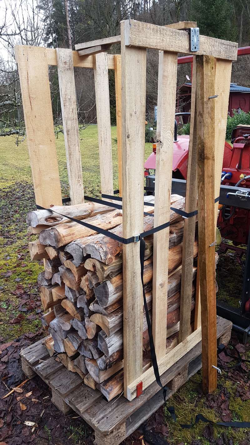 Das Stammholz wurde im Wald schon auf Meterrollen gesägt, diese nach Hause gefahren und aufgesetzt. Wenn mal was zusammen gekommen ist, dann ging es mit dem Spalter an der Biege vorbei und das gespaltene Holz wurde dahinter wieder aufgesetzt. Der nächste Schritt war dann das Meterholz auf 50cm zu sägen und in Rollgitterwägen zu setzen. Ab da war dann alles nur noch schieben und rollen, also keine Arbeit mehr.