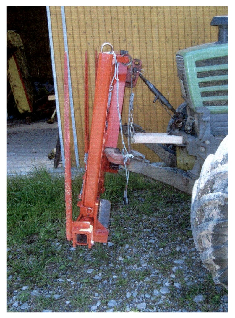 die Kette wird im Zugmaul eingehängt. Beim Betrieb in der Fronthydraulik wird betr. der Hebegeometrie ein Holzstück (Hartholzdielenstück) im Frontzugmaul befestigt, an welchem die Kette befestigt ist.