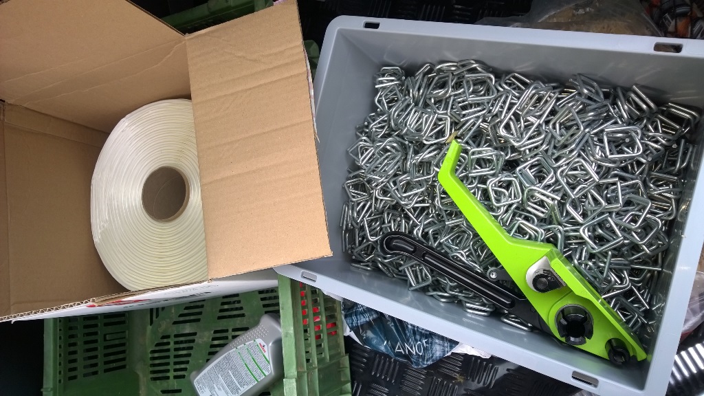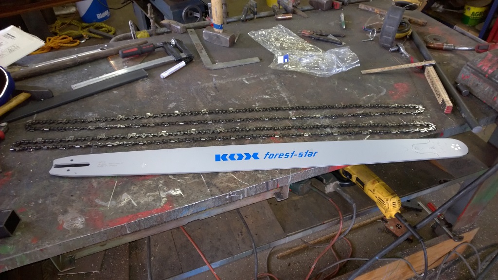 Der Galgen vom Bündelgerät ist zwischenzeitlich abmontiert, da ich auf Spanngurte umgestellt habe. Die Bänder haben sich bei mir nicht bewährt, bei einem nassen Laubholzbündel ist öfters das 25mm Band gerissen. Nach der Umstellung auf gewebtes 25mm Textilband hat das Band gehalten, dafür hat die Klammer nicht genügend geklemmt...