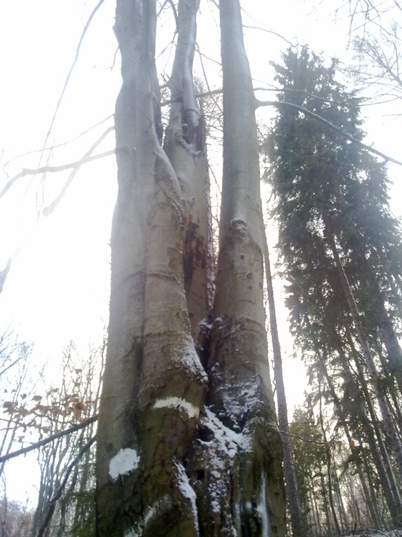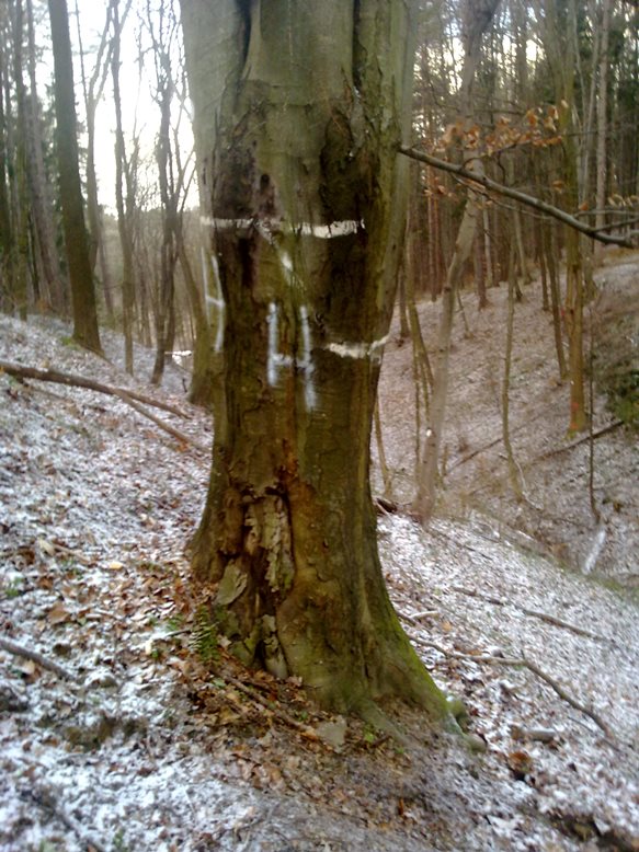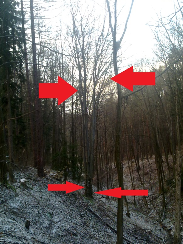 Wir haben in unseren heurigen Waldanteil ein mehrstämmig Buche stehen. Die Hangneigung ist an der Stelle etwa 45°und die Buche hat genug Platz zum hangabwärts Fallen. Der BHD ist um die 60cm und die einzelnen Zwiesel sind so 15-25cm.
