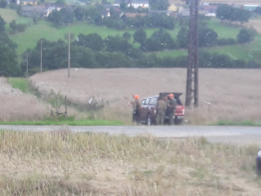 Ein Mitjäger hat hier einen mobilen Ansitzbock auf einem Pkw - Anhänger fest installiert.