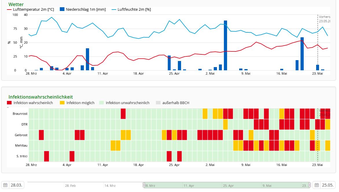 Gegen Halmbruch habe ich am Ende EC31 (zusammen mit der Wachstumsreglermaßnahme) am 21.4. 0,7 l/ha Mirage + 0,4 l/ha Aurelia angewendet. Dies sollte eigentlich vor Septoria Tritici Infektionen Ende April geschützt haben. Und danach gab es angeblich kein Infektionsrisiko. DTR wäre diesbezüglich schon plausibler. Aber laut Monitoring gibt es damit in Bayern praktisch keinen Befall. Zusätzlich sollte laut den Daten der LfL Bayern Azoxystrobin eigentlich hervorragend gegen DTR schützen (habe nun gefunden, dass es da auch starke Resistenzen gibt).
