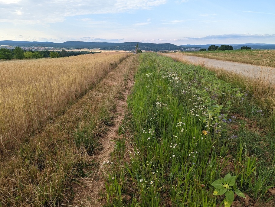 10 Meter breit, 150 lang ist der Streifen, die Hälfte davon Weizen, ansonsten Streuobst, Sonnenblumen, Hirse und so Blühzeugs. Aktuell ist übrigens der Plan, dass wir 3 Informatikdoktoranden uns mit der Sense drüber machen, und in Garben zwecks Hühnerfütterung einlagern.
