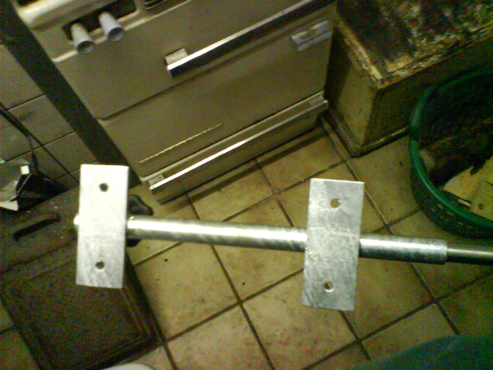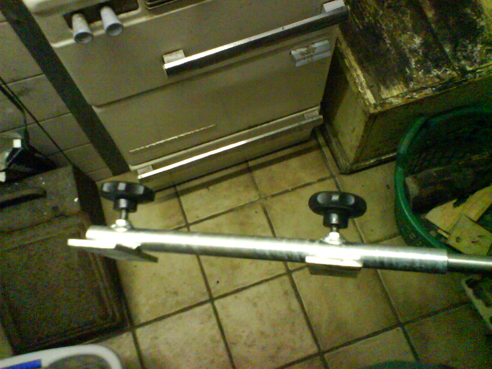 Die erste ist einfach ein Stück Stahl an der Wippe befestigen,und das Holzscheit immer soweit nachschieben,bis es so weit raus schaut wie der Flachstahl.---->Dauert zu lange bis man dickere Scheiter immer genau auf Maß mit dem Stahl hat.